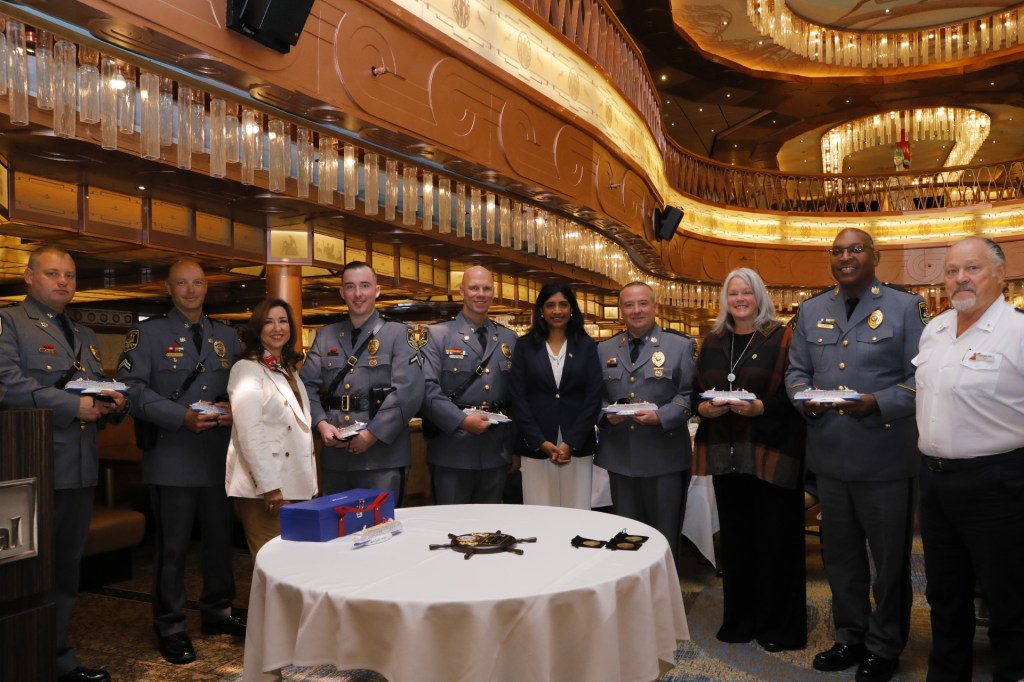 MIAMI, Oct. 28, 2024 – Commemorating 20 years of sailing from Baltimore, Carnival Cruise Line honored first responders who assisted with the Francis Scott Key Bridge collapse during a celebratory event on board Carnival Pride on Sunday. Carnival President Christine Duffy welcomed aboard dignitaries and public officials that included Maryland Lt. Gov. Aruna Miller, Maryland Transportation Secretary Paul Wiedefeld, Baltimore Deputy Mayor J.D. Merrill and Executive Director of the Maryland Port Administration Jonathan Daniels and representatives from the U.S. Naval Academy.