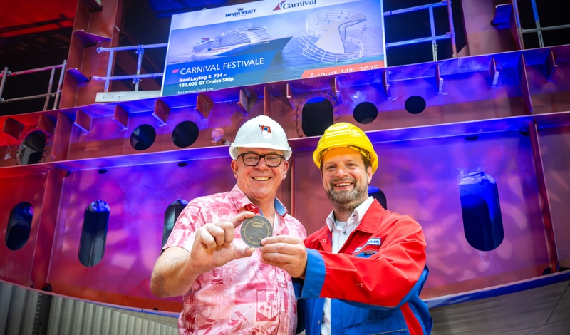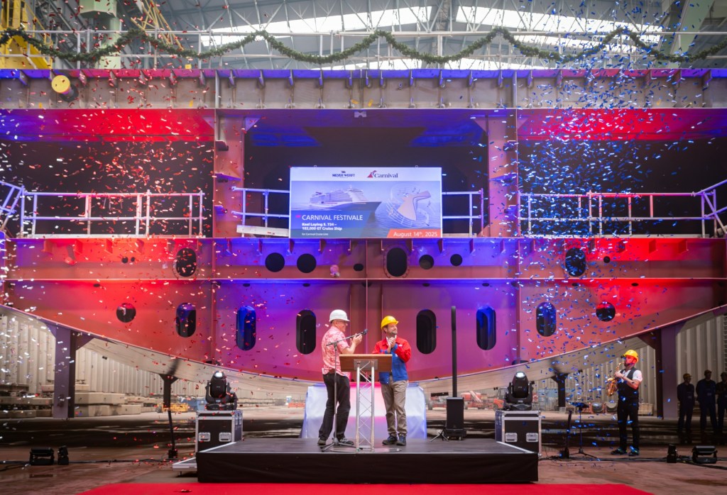Brett Vitols, associate vice president of new builds for Carnival Cruise Line and Petu Kummala, associate vice president of interior design and architecture, along with members of Carnival’s new build team, were joined by the Meyer Werft team, including Georg Schauen, project manager for Carnival Festivale, to celebrate the construction milestone by placing commemorative coins under a 598-ton keel block. The coins, inscribed with musical notes, signify good luck for the vessel.